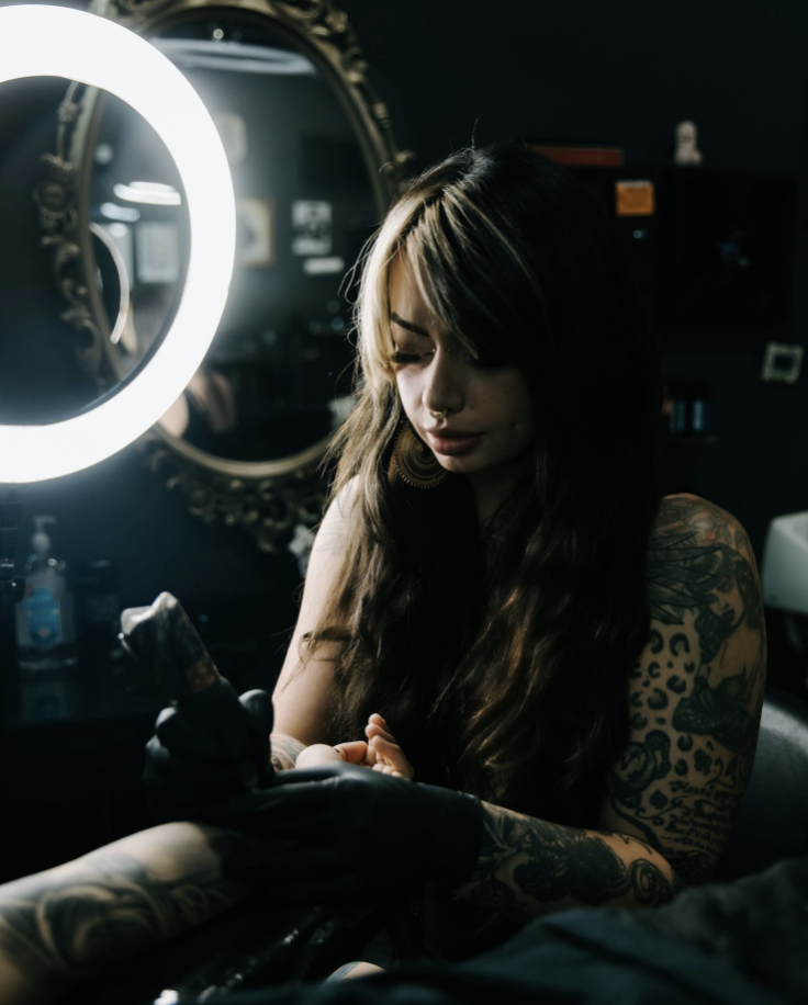 Influenced by her family’s history in art, multicultural background along with punk and hip hop music scenes, she puts a heavy interest un juxtaposition in all of her works and believes that the art she puts on your body is all about collaboration and connection.